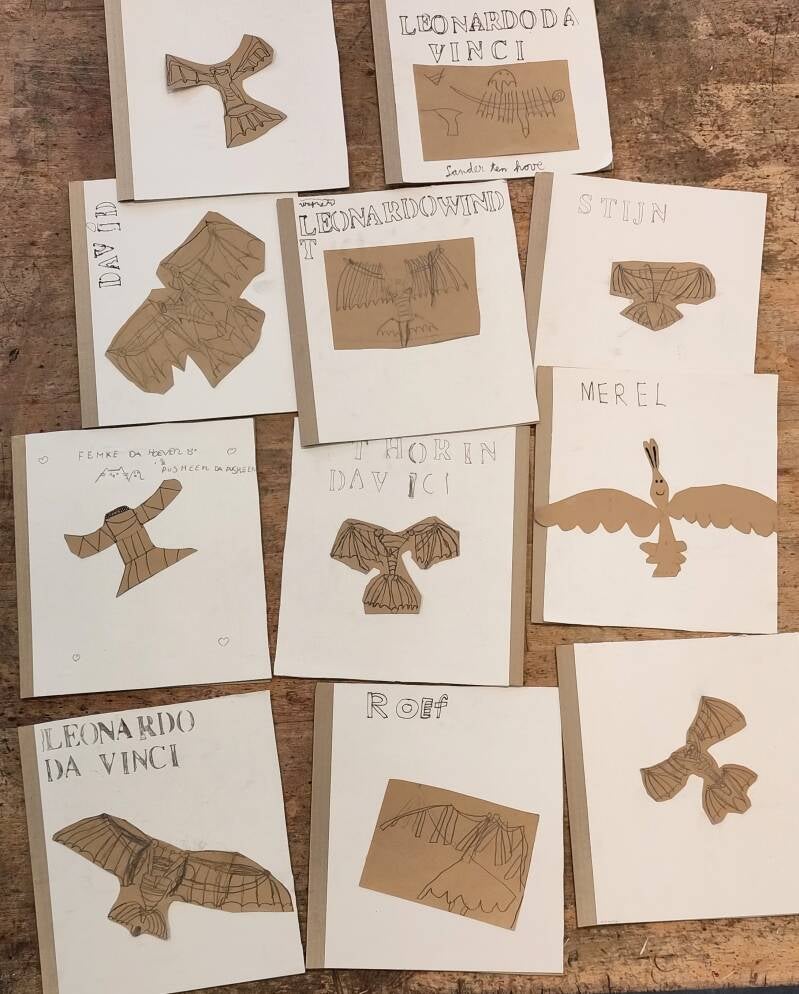 Vandaag maakten de kinderen van groep 6 (van de GJ van den Brinkschool) de voorkant van het schets-/uitklapboek. Aan de hand van een paar oefeningen tekenden ze hele toffe vliegmachines!