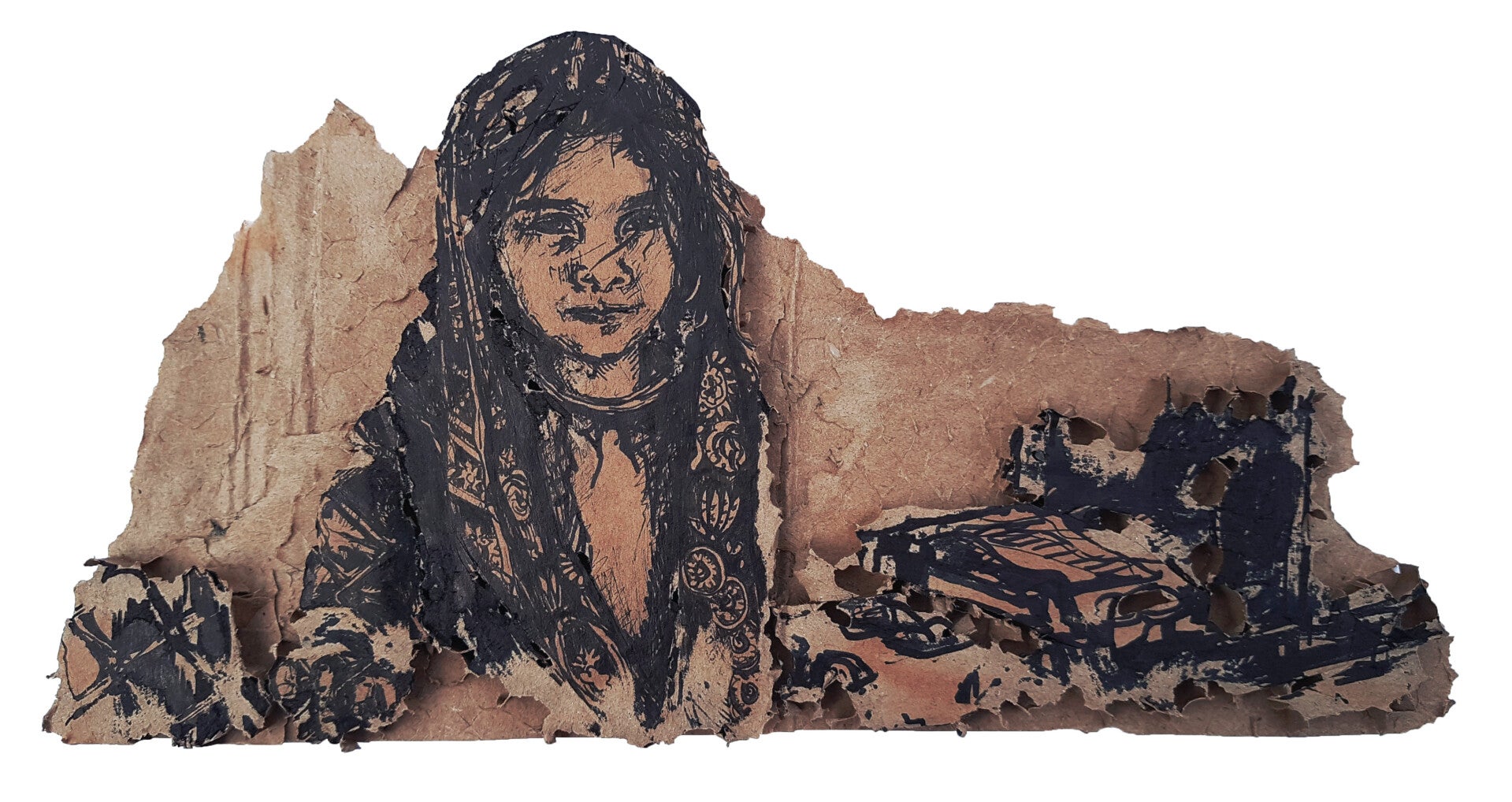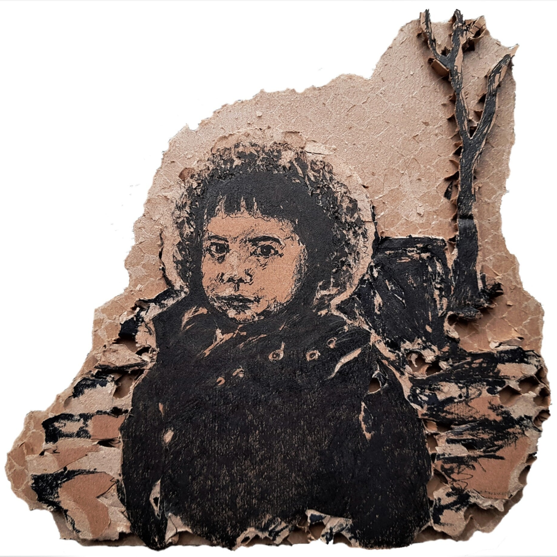 Een tekening op karton van een meisje in een vluchtelingenkamp op het eiland Lesbos;...omdat zij de moeite waard is ( ...en het winter wordt en koud en nat is in haar tent), 2021